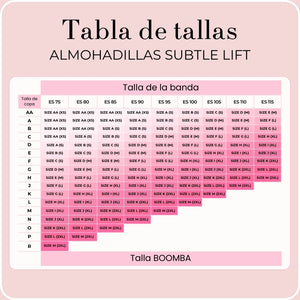 Para Subtle Lift, la talla Extra-Small se enviará para la copa AA. La talla Small se enviará para las copas A, B y C. La talla Medium se enviará para las copas D y E. La talla Large se enviará para las copas F y G. La talla Extra-Large se enviará para las copas H, I y J, y la talla 2Extra-Large se enviará para las copas K, L y M.