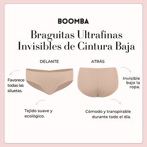 Las Braguitas Ultrafinas Invisibles de Cintura Baja de BOOMBA son como tu secreto mejor guardado: ¡ultra suaves, sin costuras y muy cómodas! Con un corte bajo y un tejido transpirable, son invisible bajo la ropa y te proporcionan un aspecto suave y perfecto. Perfectas para llevar a diario o debajo de tus conjuntos ajustados favoritos. ¡La comodidad se une a la belleza!
