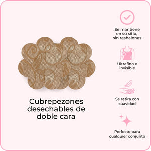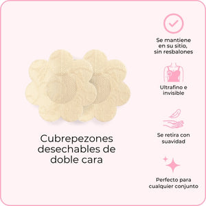 Los primeros Cubrepezones desechables de doble cara del mundo. Un lado diseñado para sujetarse a tu prenda y el otro se pega a ti. Evita que tus pezones se salgan, a la vez que permanece indetectable bajo tu ropa.
