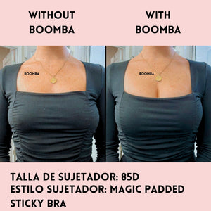 El relleno natural del sujetador adhesivo de BOOMBA elimina la apariencia voluminosa que suelen tener otros sujetadores con relleno. El nuestro está diseñado para curvarse con sus senos, creando una apariencia natural más completa.
