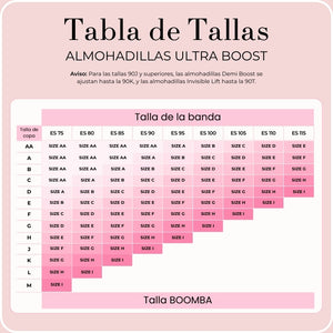 Para tallas a partir de la 90J, nuestras almohadillas Demi Boost (doble push-up) están disponibles en tallas hasta la 90N y nuestras almohadillas Invisible Lift (ligeramente acolchadas) están disponibles en tallas hasta la 90T.