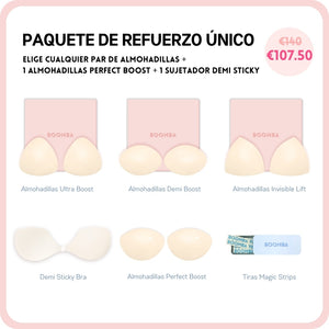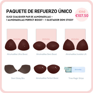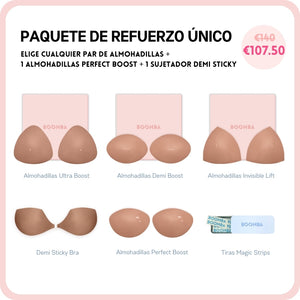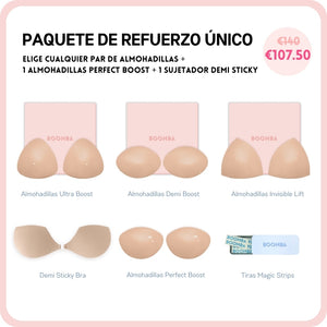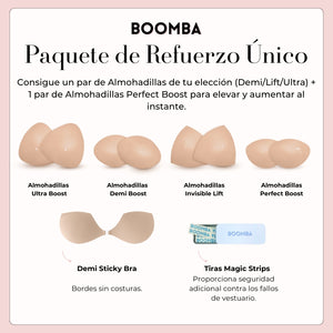 Conoce tu reacción a una apariencia realzada al instante. Este paquete contiene un par de almohadillas Perfect Boost recientemente lanzadas que aumentan el tamaño de tu copa hasta una tallaa, un par de almohadillas BOOMBA a su elección, un Sujetador Demi Sticky para una bordes sin costuras y un rollo de cinta de moda para solucionar sus outfits instantáneamente.