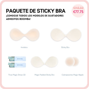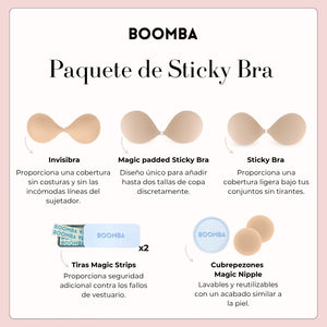 Prepárate para cualquier outfit. ¡Este paquete de sujetadores adhesivos BOOMBA incluye nuestro top ventas, el Invisibra, un Sticky Bra y nuestra última incorporación, el Magic Padded Sticky Bra! También incluye nuestras famosas Cubrepezones Magic Nipple, junto con 2 latas de magic strips.