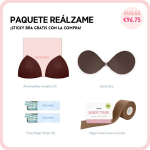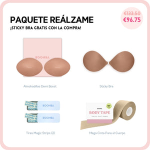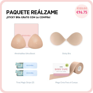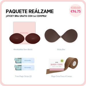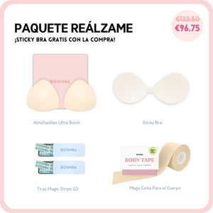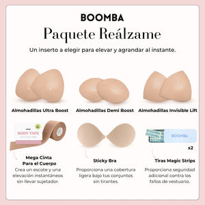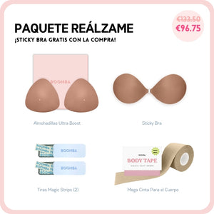 Si buscas un poco más de escote o simplemente quieres añadir ese toque a tu conjunto, este pack es perfecto para ti. Este pack incluye 1 par de insertos, 1 sujetador adhesivo Sticky Bra, 2 cajitas de tiras Magic Strips BOOMBA y 1 Cinta Sujetador MEGA Body Tape. El pack te ayudará a tener esa elevación natural y volumen.